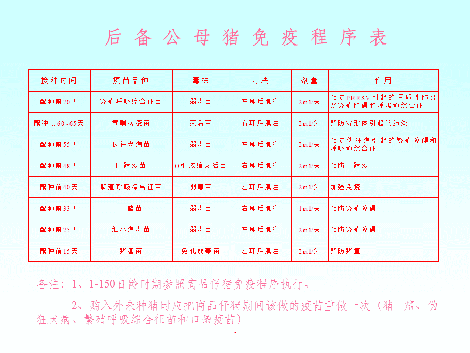 4、伪狂犬病毒疫苗:这是一种影响母猪繁殖健康的病毒,需按照免疫程序表进行接种。