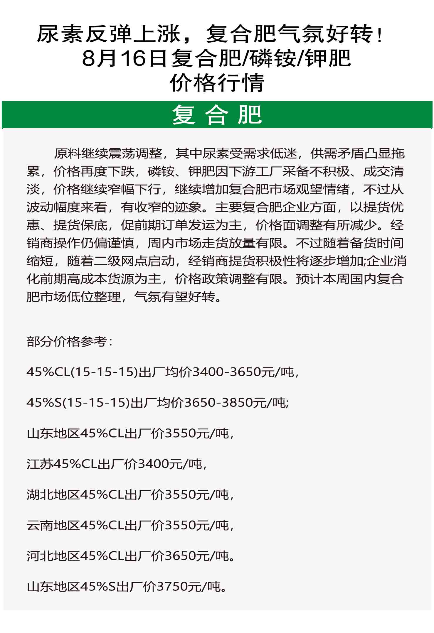 对于每种化肥(氮肥、磷肥、钾肥、复合肥),可以增加一些具体的价格数据或涨跌幅度,这样会使内容更具体、更有说服力。